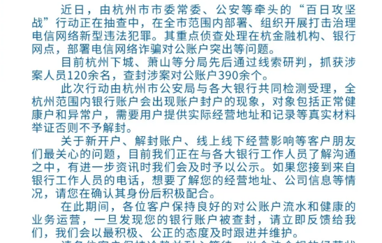 近日,杭州市在市公安局和各大銀行共同配合檢測(cè)下開展了“百日攻堅(jiān)、反詐騙”行動(dòng),對(duì)公司、個(gè)體戶等商戶的實(shí)際經(jīng)營(yíng)地址、銀行賬戶、工商資料等有了較高的真實(shí)要求。如果您接到想要了解您經(jīng)營(yíng)情況的電話,請(qǐng)各位客戶朋友們?cè)诖_認(rèn)其身份后積極配合。如您的銀行賬戶出現(xiàn)被叫停、封查等現(xiàn)象,請(qǐng)立刻反饋給我們,具體處理事項(xiàng)請(qǐng)看以下公告: