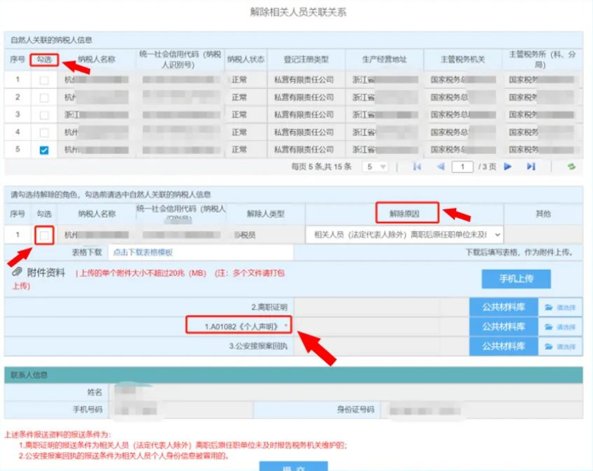 第二步:點(diǎn)擊在線辦理進(jìn)入信息填寫頁面,勾選需要解除關(guān)聯(lián)關(guān)系的企業(yè)信息據(jù)實(shí)填寫解除原因等相關(guān)信息,下載上傳附報(bào)資料,此頁面可下載《個(gè)人聲明》等模板,上傳完畢,預(yù)覽提交,等待主管稅務(wù)機(jī)關(guān)審核即可。